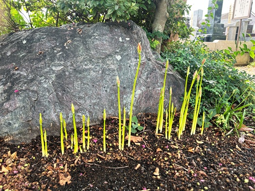 | 明日、20日(土)から秋彼岸となります。暑さ寒さも彼岸までの言葉どおり、昨日の夕立以降、一気に気温が下がり、今日の朝は三ヶ月ぶりとなる20度以下の気温となりました。曼珠沙華も彼岸入りを感じてか芽を出し始めました。 |