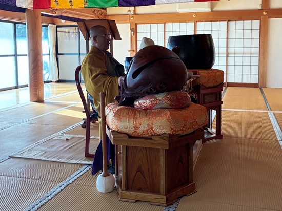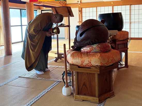 | 令和7年12月31日午後11時30分から除夜の鐘をつきはじめ、新年に入り108回の鐘をつき終えました。今年は風もなく、また、気温も低くなく穏やかな新年のスタートとなりました。0時15分からは新年大般若祈祷会を行いました。大般若祈祷会は、経典を大きく開く作法で転読することで、今年1年の世界平和、国家安泰、家内安全、無病息災、厄除け、合格祈願、所願成就などを祈願すると共に、檀信徒のみなさまの無病息災を祈念するご祈祷の法要です。 大般若の経典を転読の際に、経本を左右前後に傾けながら起こす風は「般若の梵風」とよび、この風にあたれば、一年間の無病息災、一切の災いを吹き除くといわれています。 お参りに来ていただいた方には、引き続き、朝課の様子も見ていただきました。 |