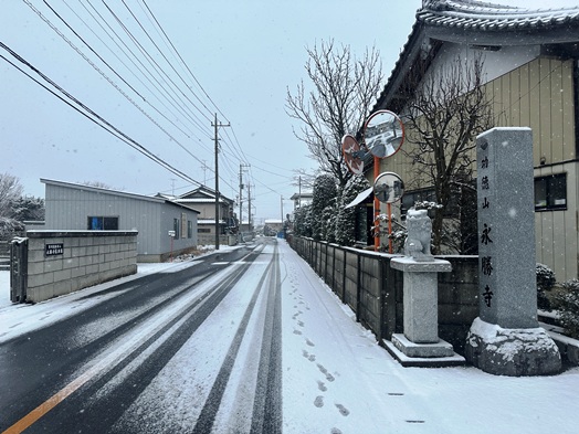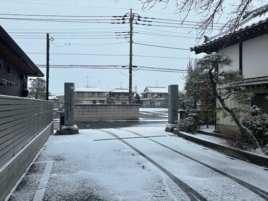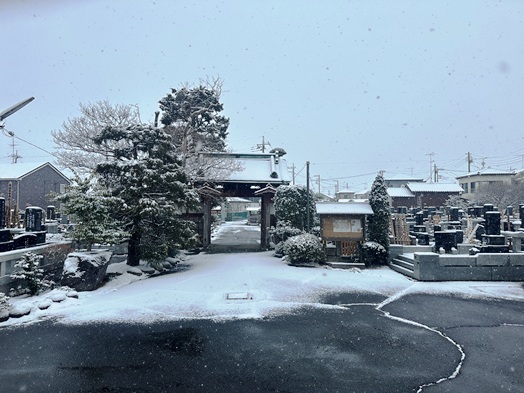 | 夕方から降り出した雨が天気予報どおり雪になりました。道路も積雪がありますので、明日のお参りは十分気をつけてください。 |