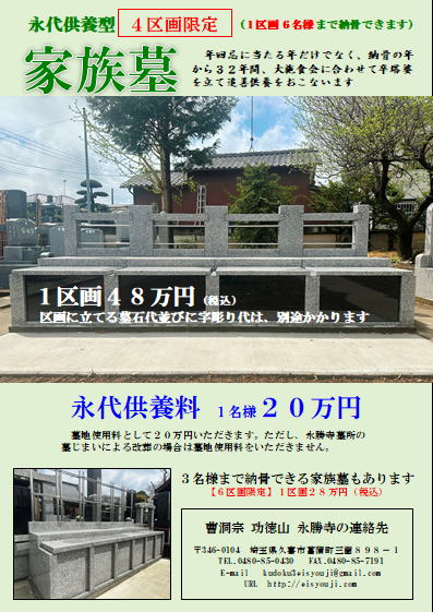 永勝寺では、昨年受付を開始した4名様まで安置できる家族墓完売に伴い、新たに、3名様まで安置できる家族墓と6名様まで安置できる家族墓の造成を致しました。 永代供養の考えは従来どおり、年回忌に当たる年だけでなく、毎年、納骨の年から32年間にわたり大施食会に合わせて卒塔婆を立て追善供養を行わせていただきます。 また、墓地使用料については、永勝寺墓所の墓じまいによる改葬の場合は、墓地使用料を頂きません。なお、1区画の金額に加え、区画に立てる墓石代並びに字彫り代が別途かかることになります。 |