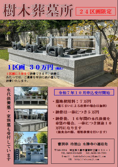 檀家様のご要望にお応えし、令和7年10月から樹木葬墓所の受付をはじめます。納骨は一体につき5万円、希望がある場合は永代供養もさせていただきます。1区画で、5体まで納骨することが可能です。 |